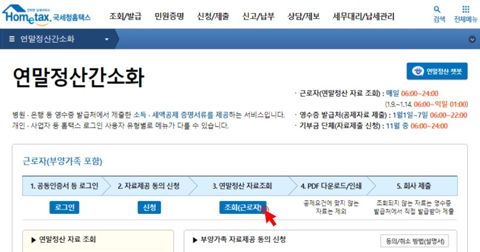 3. 화면 중앙부분의 연말정산 자료조회 아래의 '조회(근로자)'를 클릭합니다.